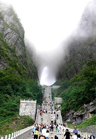 選擇乘索道游覽天門(mén)山是最佳視角。索道吊廂一出站房,馬上就騰空飛了起來(lái),從城市的一棟棟樓頂掠過(guò),猶如在城市上空滑翔。翻過(guò)一道山梁之后,城市被遠(yuǎn)遠(yuǎn)拋在了視線(xiàn)以外,大片翠綠的稻田映入眼簾,透過(guò)打開(kāi)的通風(fēng)窗口,一陣陣青草水田特有的清香沁入心脾;蚋呋虻偷霓r(nóng)舍不時(shí)從我們身下滑過(guò),牛羊們?nèi)齼蓛捎崎e的在田間浮動(dòng)著,靜謐、安詳。再翻過(guò)一座山峰,我們便立即被滿(mǎn)山的青翠所包圍,萬(wàn)仞絕壁也已投懷送抱。索道支架矗立于絕壁天險(xiǎn)中,或挺立或傾倒或探頭或擁抱,我們繼續(xù)在艱險(xiǎn)中游歷,時(shí)而隱沒(méi)于云堆,時(shí)而出世于蒼穹。這時(shí)你除了那滿(mǎn)懷的驚險(xiǎn)刺激外有的便只有望索而興嘆了。我拍了很多片子,但是總覺(jué)得還是沒(méi)有足以記錄下來(lái)這座空中盆景的壯麗。