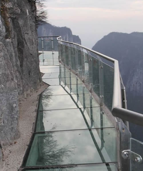 2011年10月1日,張家界天門山國(guó)家森林公園新建的玻璃棧道正式對(duì)游客開放。玻璃棧道懸于天門山頂西線,長(zhǎng)60米,最高處海拔1430米。是張家界天門山景區(qū)繼懸于峭壁之上的鬼谷棧道、憑空伸出的玻璃眺望臺(tái)、從玻璃臺(tái)可以看見下面。玻璃臺(tái)伸出棧道有4-5米,專供游人拍照、橫跨峽谷的木質(zhì)吊橋后打造的又一試膽力作。為了讓游客零瑕疵的透過(guò)玻璃橋看到美麗的風(fēng)景,上橋的游客均要求戴上鞋套,以保持玻璃橋的透明和干凈。玻璃棧道的刺激震撼,可與舉世聞名的美國(guó)大峽谷玻璃走廊“天空之路”媲美,因而有了東方“天空之路”的美譽(yù)。