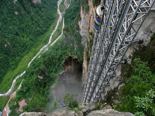 百龍電梯位于世界自然遺產(chǎn)張家界武陵源風(fēng)景區(qū)。工程分布在4.5公里,垂直高差385米的核心景區(qū)。電梯運(yùn)行高度326米,主體由154米山體豎井和172米貼山鋼結(jié)構(gòu)井架等組成,采用三臺(tái)雙層全暴露觀光電梯并列分體運(yùn)行。是連通森林公園、金鞭溪、水繞四門到袁家界、烏龍寨、天子山的重要觀光交通設(shè)施。百龍?zhí)焯莨こ毯陚、工藝?fù)雜,施工驚險(xiǎn),堪稱“世界工程奇觀”。它的建成創(chuàng)造了三項(xiàng)基尼斯世界紀(jì)錄。