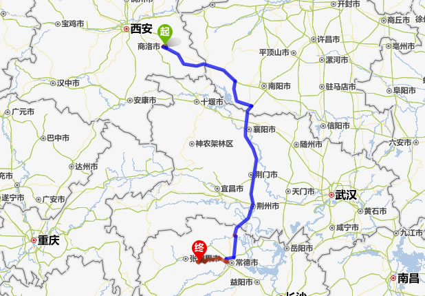 左右,沿途經過商洛——襄陽——荊門——荊州——澧縣——石門縣——慈利縣——張家界市。